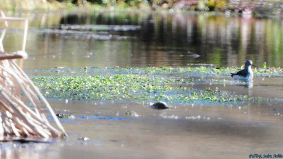 Parece que no pueden vivir muy lejos las unas de los otros. Es habitual encontrar una Lavandera cerca de un Andarríos, aunque no sé todavía porqué. Los Andarríos tienen muy poco de eso, si lo que se les supone es que andan incansablemente. La verdad es que, si les gusta un comedero, por ejemplo este lugar donde hay un tapiz de Lentejas de agua, pueden pasar en él varias horas. Luego, bien porque deciden cambiar de comedero, bien porque hay una amenaza, salen volando a ras del río, con un chillido estridente.